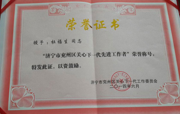 經(jīng)典集團(tuán)總經(jīng)理杜福生榮獲“兗州區(qū)關(guān)心下一代先進(jìn)工作者”榮譽稱號