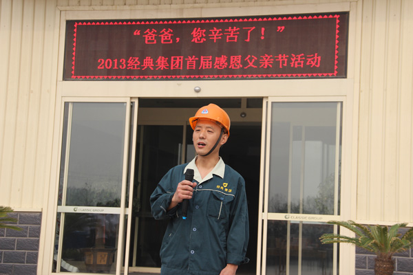 2013616日上午7點(diǎn)30分,經(jīng)典集團(tuán)開展2013年度父親節(jié)“送溫暖,獻(xiàn)愛心”活動(dòng),為集團(tuán)全體員工的父親送上愛心手機(jī),千元節(jié)日紅包,集團(tuán)董事長苗樹文,總經(jīng)理杜福生及高層領(lǐng)導(dǎo)先后致辭并發(fā)放獎(jiǎng)金及手機(jī)。活動(dòng)舉行完后,經(jīng)典集團(tuán)總經(jīng)理杜福生親自到部分員工家中為員工父親送上集團(tuán)的問候與節(jié)日祝福。
