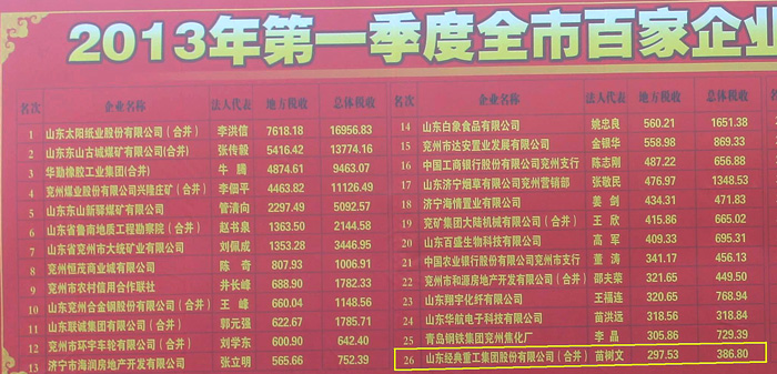 賀經(jīng)典集團(tuán)進(jìn)入兗州2013年第一季度納稅企業(yè)前30強(qiáng)