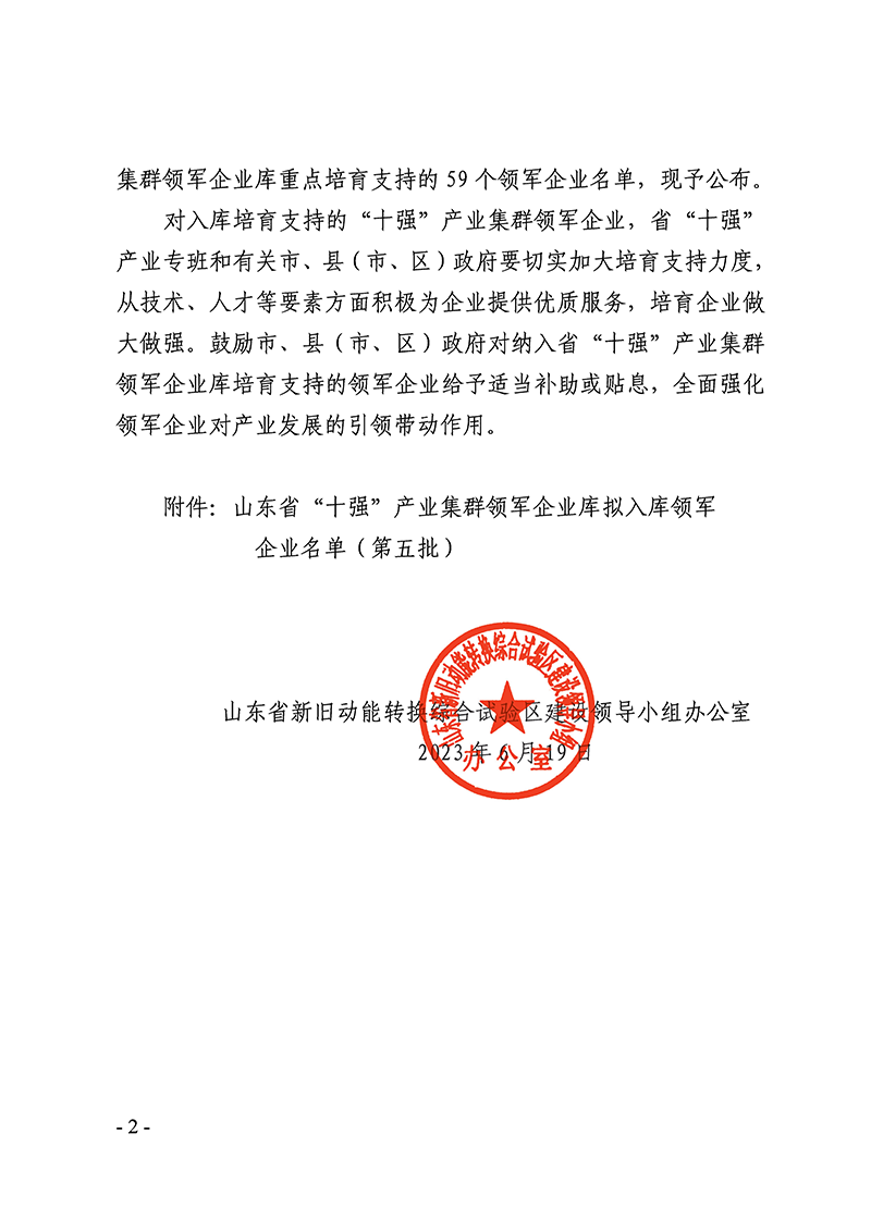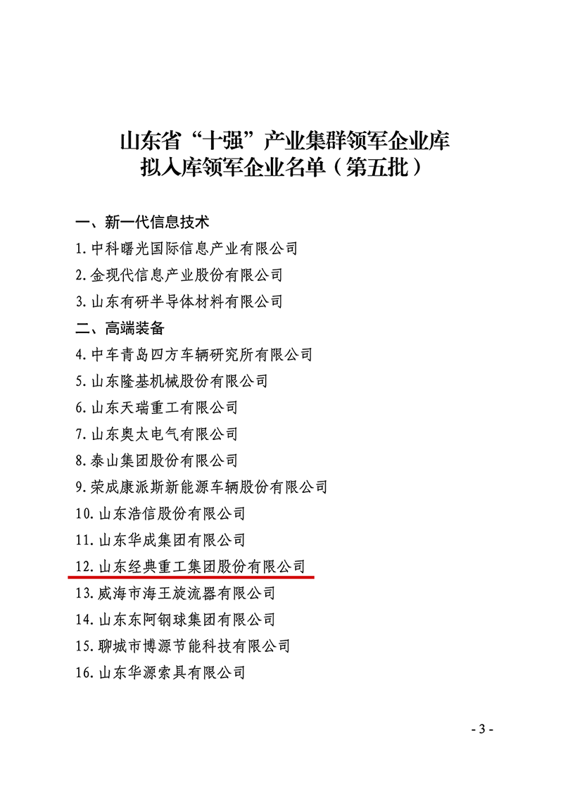 6月19日,山東省新舊動(dòng)能轉(zhuǎn)換綜合試驗(yàn)區(qū)建設(shè)領(lǐng)導(dǎo)小組辦公室發(fā)布了《關(guān)于公布山東省“十強(qiáng)”產(chǎn)業(yè)集群領(lǐng)軍企業(yè)名單(第五批)的通知》(魯動(dòng)能辦【2023】16號),山東經(jīng)典重工集團(tuán)股份有限公司成功入選山東省“十強(qiáng)“產(chǎn)業(yè)集群領(lǐng)軍企業(yè)名單。