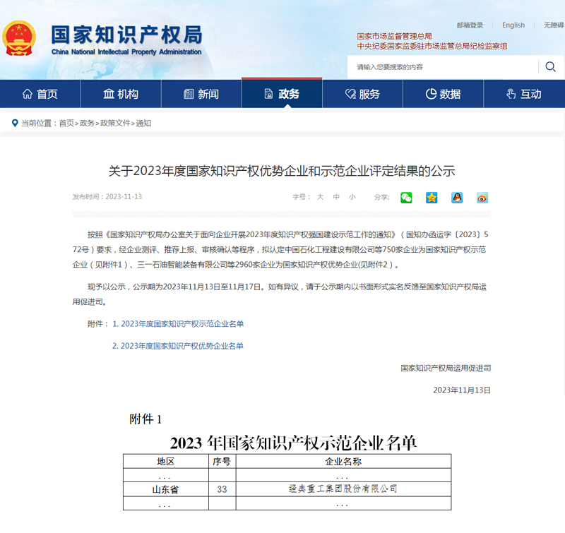 近日,國家知識產(chǎn)權(quán)局對2023年度國家知識產(chǎn)權(quán)示范企業(yè)和優(yōu)勢企業(yè)評定結(jié)果的公示。其中,經(jīng)典集團被認定為“2023年國家知識產(chǎn)權(quán)示范企業(yè)”。